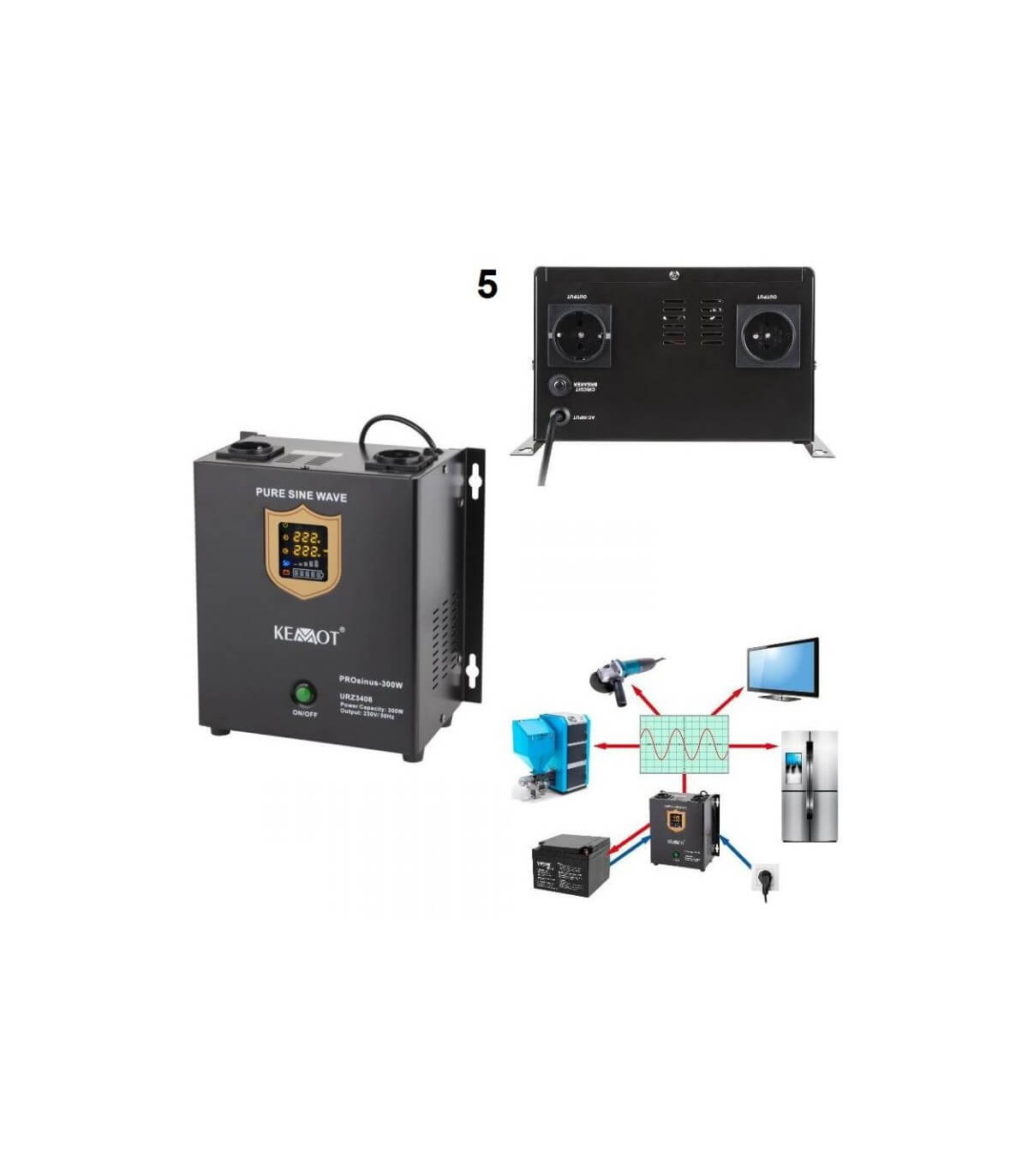 - Kaip avarinio maitinimo šaltinis su įkrovimo funkcija - jis paverčia 12V nuolatinės srovės įtampą, tiekiamą iš išorinės baterijos į AC 230V, ir įkrauna išorinę bateriją.